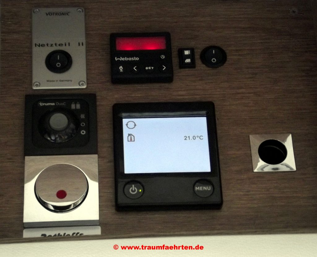 Auf unseren Wunsch wurde unsere neue Webasto Dieselheizung durch die Installation eines zusätzlichen Schalters mit 2 Steuerungsvarianten ausgestattet: Wird die Dieselheizung über das über der Wohnraumtür angebrachte Webasto Panel gesteuert, läuft sie im Dauerbetrieb. Wird der zusätzlich eingebaute Schalter betätigt, geht die Dieselheizung nur so lange in Betrieb, so lange die Pumpe der Alde Heizung läuft. Ist die gewünschte, das heißt, die am Alde Panel eingestellte Raumtemperatur erreicht, schaltet sich sowohl die Alde Pumpe als auch die Dieselheizung ab. Auf diese Weise wird, da die Dieselheizung nicht mehr ständig im Dauerbetrieb läuft, zum einen an Diesel als auch an dem von den Bordbatterien generierten Strom gespart. Unsere Ansicht nach eine prima Sache, wodurch sich die Webasto Thermo Top C noch effizienter betreiben lässt.